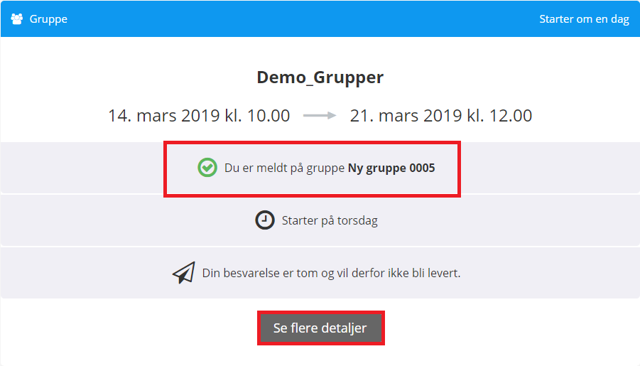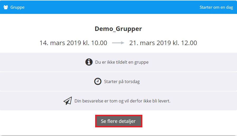 Dersom du ikke er tildelt en gruppe, vil du heller ikke kunne åpne prøven i Inspera når den starter. Hvis du ser at du ikke er tildelt en gruppe når du klikker "Se flere detaljer", må du ta kontakt med instituttet som administrerer emnet.