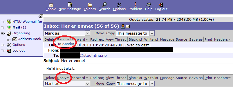 Kvote: Det er grenser for hvor mye du kan ha lagret i Webmail. For å se om du har nådd grensen, kan du logge inn på e-posten din, trykke på tannhjulet i øvre høyre hjørne, for deretter å søke etter lagringsplass. Studenter og ansatte har en kvote på 100 GB.