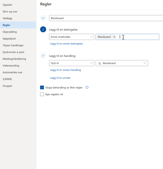Når det kommer e-post med "blackboard" i emnet, flyttes e-posten til Blackboard-mappen.